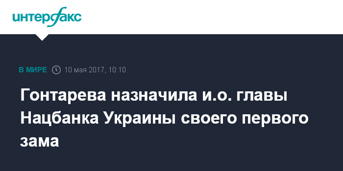 Москва. 10 мая. INTERFAX.RU - Глава Национального банка Украины Валерия Гонтарева в связи с поданным заявлением об отставке назначила с 11 мая исполняющего обязанности главы НБУ.