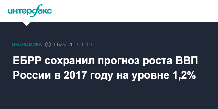 Москва. 10 мая. INTERFAX.RU - Европейский банк реконструкции и развития сохранил свой прогноз роста ВВП РФ в 2017 году на уровне 1,2%, ожидает роста российской экономики на 1,4% в следующем году, говорится в докладе банка. Минэкономразвития в базовом варианте прогнозирует подъем российской экономики на 2% в 2017 году, ЦБ РФ менее оптимистичен и ожидает роста ВВП в интервале 1-1,5%.