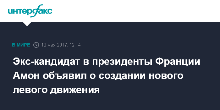 Москва. 10 мая. INTERFAX.RU - Выбывший в первом туре президентских выборов во Франции кандидат от социалистов Бенуа Амон заявил, что создает новое движение левого толка, сообщают французские СМИ.