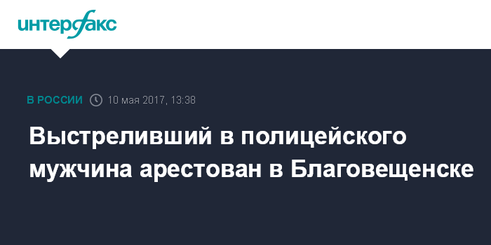Москва. 10 мая. INTERFAX.RU - Мужчина, устроивший стрельбу в районе железнодорожного вокзала в Благовещенске Амурской области и ранивший сотрудника полиции, по решению Благовещенского городского суда заключен под стражу.
