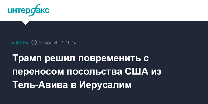 Трамп в период предвыборной кампании обещал реализовать закон о переносе посольства в Иерусалим. Однако сейчас он решил отложить этот шаг. Соответствующий указ новому президенту США впервые предстоит подписать в июне. По данным СМИ, о намерении сделать это Белый дом уже уведомил израильское правительство.