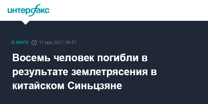 Москва. 11 мая. INTERFAX.RU - Жертвами землетрясения в Синьцзян-Уйгурском автономном районе Китая, по предварительным данным, стали не менее восьми человек, еще 11 человек получили травмы, сообщили китайские СМИ.