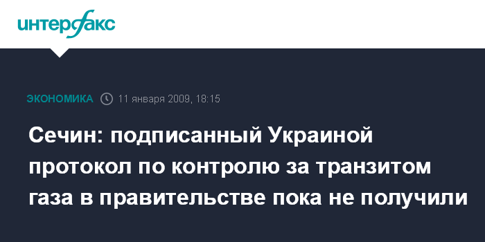 Москва. 11 января. INTERFAX.RU - В правительстве до сих пор не получили подписанный Украиной протокол по контролю за транзитом российского газа, доложил вице-премьер Игорь Сечин президенту России Дмитрию Медведеву.