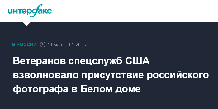 Москва. 11 мая. INTERFAX.RU - Бывшие сотрудники американских спецслужб выразили обеспокоенность тем, что на встречу президента США Дональда Трампа и главы МИД России Сергея Лаврова в Белый дом был допущен российский фотограф, сообщает в четверг газета The Washinhton Post.