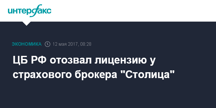 Москва. 12 мая. INTERFAX.RU - ЦБ РФ отозвал лицензию на осуществление страховой брокерской деятельности у ООО "Страховой брокер "Столица" (Москва), говорится в сообщении регулятора.