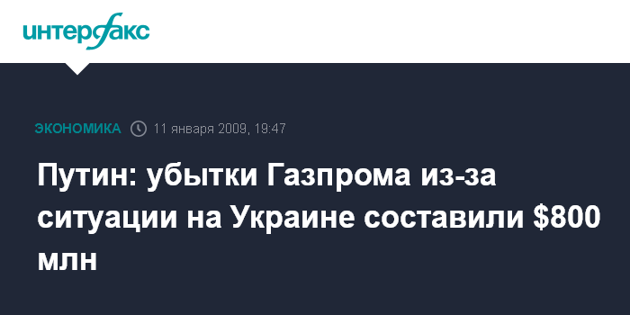 "За эти дни прекращения поставок через Украину "Газпром" понес убытков около $800 миллионов. "Газпром" вынужден был остановить работу свыше 100 скважин, правда, без опасности технологических последствий", - заявил Путин в интервью немецкому телеканалу ARD, которое выйдет в эфир 14 января. По словам премьера, "Газпром" несет и имиджевые издержки.