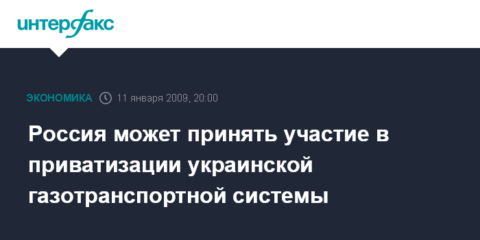 Москва. 11 января. INTERFAX.RU - Россия готова участвовать в приватизации украинской газотранспортной системы, заявил премьер-министр РФ Владимир Путин.