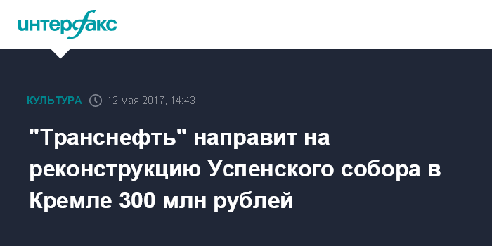 Москва. 12 мая. INTERFAX.RU - "Транснефть" в рамках соглашения с Музеями Московского Кремля окажет практическую помощь в реставрации Успенского собора, которая начнется в 2017 году и рассчитана на 5-7 лет.