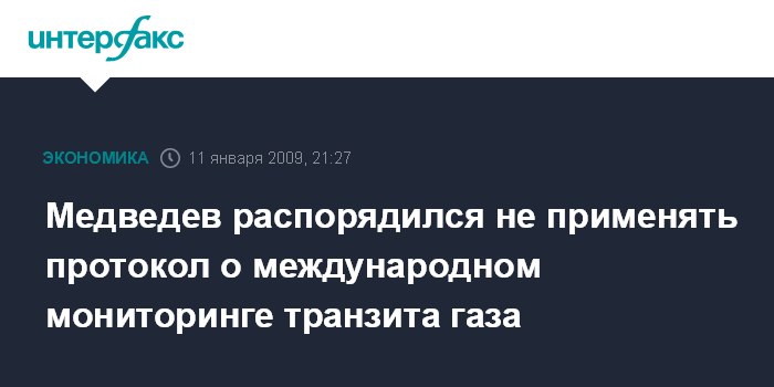 Москва. 11 января. INTERFAX.RU - Президент РФ Дмитрий Медведев дал указание правительству РФ не применять подписанный Украиной протокол о многостороннем, международном механизме мониторинга за транзитом российского газа в Европу через Украину до того, как украинская сторона не снимет свои оговорки к этому документу.