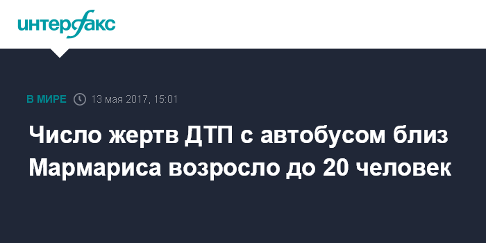 Москва. 13 мая. INTERFAX.RU - Не менее 20 человек стали жертвами ДТП с участием туристического автобуса, которое произошло на юго-западе Турции в районе города Мармарис, сообщают в субботу западные СМИ со ссылкой на губернатора провинции Мугла Амира Чичека.