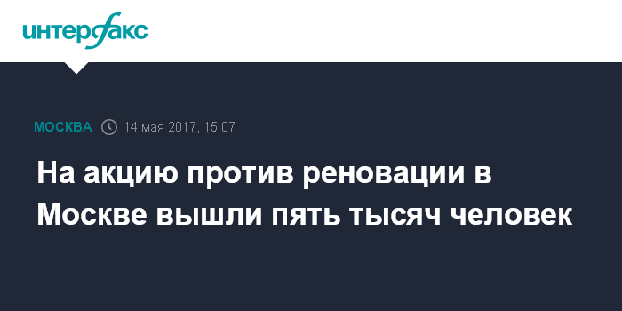 Москва. 14 мая. INTERFAX.RU - Порядка пяти тысяч человек принимают участие в согласованном митинге по вопросу реновации городского жилья в центре Москвы, сообщили "Интерфаксу" в воскресенье в пресс-службе столичного главка полиции.