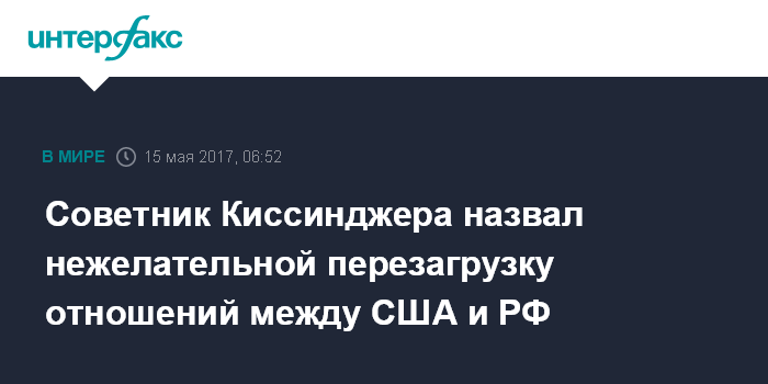 Москва. 15 мая. INTERFAX.RU - Новая перезагрузка между США и РФ сейчас нежелательна и нереальна, заявил профессор Йельского университета, директор консалтинговой компании "Kissinger Associates" Томас Грэм в интервью, опубликованном в понедельник в газете "Известия".