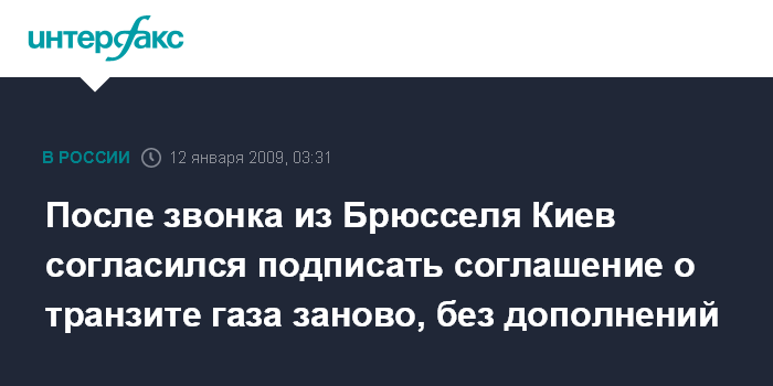 Брюссель. 12 января. ИНТЕРФАКС - Киев согласился еще раз подписать "Протокол по международному контролю за транзитом российского газа через территорию Украины европейским потребителям", но уже без каких-либо дополнений.