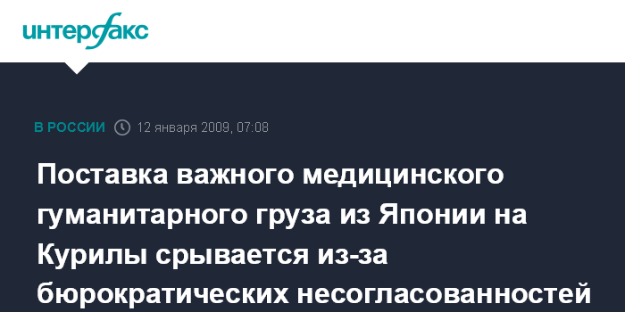 Южно-Сахалинск. 12 января. ИНТЕРФАКС - ДАЛЬНИЙ ВОСТОК - Доставка гуманитарного груза для медучреждений трех Курильских островов, запланированная на 13 января, из-за бюрократической несогласованности осталась под вопросом.
