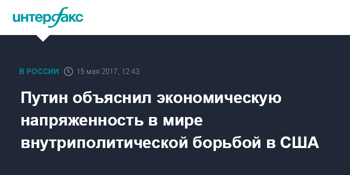 Москва. 15 мая. INTERFAX.RU - Президент РФ Владимир Путин считает, что продолжающаяся в США внутриполитическая борьба создает политическую и экономическую напряженность во всем мире.