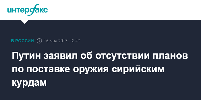 Москва. 15 мая. INTERFAX.RU - Президент РФ Владимир Путин заявил, что Россия не будет поставлять вооружение курдским формированиям в Сирии, и выразил мнение, что такую работу не стоит активизировать.