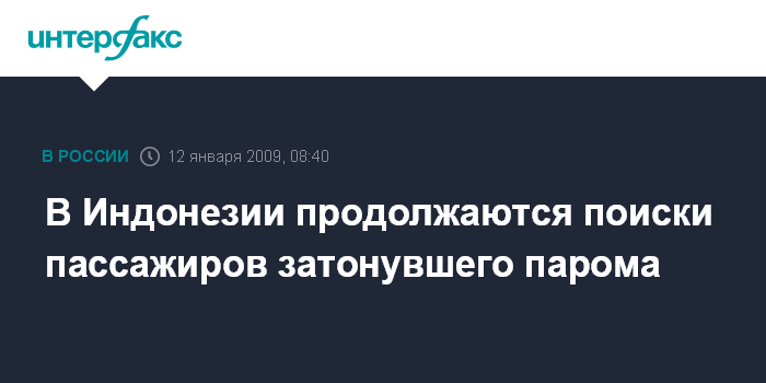 Москва. 12 января. INTERFAX.RU - Не менее 250 человек продолжают числиться пропавшими без вести после того, как в ночь на понедельник у берегов индонезийского острова Сулавеси затонул пассажирский паром, сообщает во понедельник министерство транспорта Индонезии.