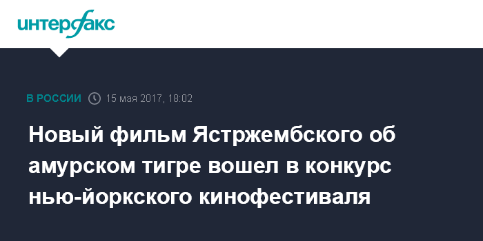 Москва. 15 мая. INTERFAX.RU - Новый документальный фильм Сергея Ястржембского "Тигры и люди" о главных угрозах выживанию амурского тигра на Дальнем Востоке вошел в конкурсную программу 7-го Кинофестиваля по защите окружающей среды, который пройдет в Нью-Йорке с 19 по 29 октября 2017 года.