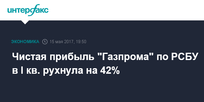Москва. 15 мая. INTERFAX.RU - Чистая прибыль головной компании ПАО "Газпром" по РСБУ за первый квартал 2017 года снизилась на 42% - до 107,64 млрд рублей со 187,207 млрд рублей за январь-март 2016 года, говорится в ежеквартальном отчете компании.