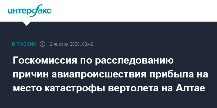 Москва. 12 января. INTERFAX.RU - На место падения вертолета Ми-171 авиакомпании "Газпромавиа" в горном Алтае прибыла госкомиссия по расследованию причин авиакатастрофы, следователи прокуратуры, а также спасатели МЧС России, которые эвакуируют тела погибших.