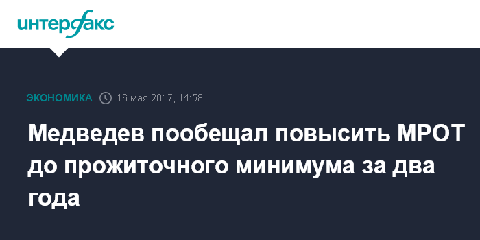 Москва. 16 мая. INTERFAX.RU - Премьер-министр Дмитрий Медведев заявил, что вопрос о выравнивании МРОТ и прожиточного минимума будет закрыт за два года.