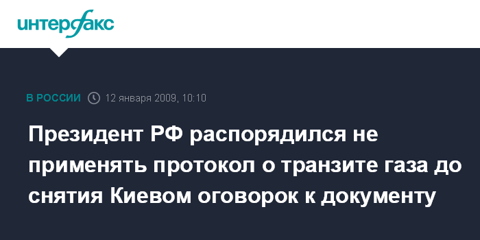 Москва. 12 января. INTERFAX.RU - Президент РФ Дмитрий Медведев дал указание правительству РФ не применять подписанный Украиной протокол о многостороннем международном механизме мониторинга за транзитом российского газа в Европу через Украину до того, как украинская сторона не снимет свои оговорки к этому документу.