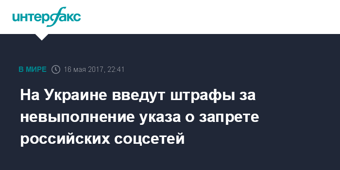 Москва. 16 мая. INTERFAX.RU - Национальная комиссия Украины, осуществляющая государственное регулирование в сфере связи и информатизации, предупредила интернет-провайдеров об административной ответственности и наложении штрафа за невыполнение указа президента о запрете на Украине ряда российских социальных сетей и веб-сервисов в виде штрафа в размере до двухсот необлагаемых минимумов доходов граждан.