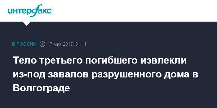 Москва. 17 мая. INTERFAX.RU - Спасатели извлекли из-под завалов тело третьего погибшего в результате взрыва бытового газа в жилом четырехэтажном доме в Советском районе Волгограда, сообщила "Интерфаксу" официальный представитель регионального следственного управления СКР Наталия Куницкая.