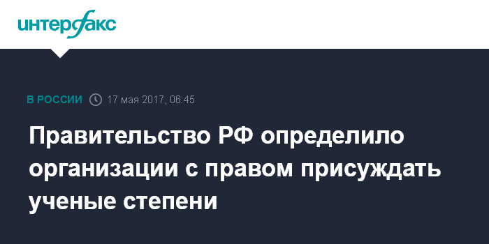 Москва. 17 мая. INTERFAX.RU - Премьер-министр России Дмитрий Медведев подписал постановление о формировании перечня научных и образовательных организаций, которым предоставляется право самостоятельно присуждать ученые степени, сообщает сайт правительства РФ.
