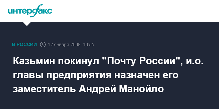 Москва. 12 января. INTERFAX.RU - Генеральный директор ФГУП "Почта России" Андрей Казьмин с 14 января покидает пост генерального директора предприятия в связи с переходом на другую работу, говорится в сообщении "Почты России".