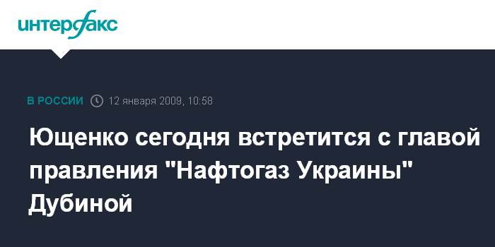 Москва. 12 января. INTERFAX.RU - Президент Украины Виктор Ющенко в понедельник в 11.00 встретится с главой правления НАК "Нафтогаз Украины" Олегом Дубиной.