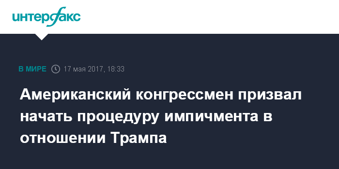 "Президент Трамп совершил деяние, за которое он должен быть привлечен к ответственности Палатой представителей (Конгресса США). Это деяние заключается в создании помех законному расследованию связей кампании президента (Трампа) и российским влиянием на выборы президента 2016 года. Ответственность президента, как известно из конституции, - это импичмент", - отметил Грин.