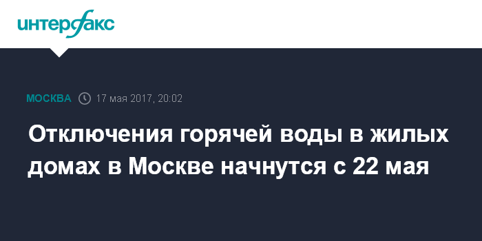 Москва. 17 мая. INTERFAX.RU - Профилактические отключения горячей воды у потребителей продолжительностью не более 10 дней начнутся в Москве 22 мая, сообщили "Интерфаксу" в пресс-службе ПАО "Московская объединенная энергетическая компания" в среду.