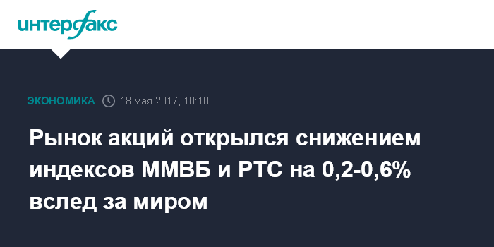 Рынок акций открылся снижением индексов ММВБ и РТС на 0,2-0,6% вслед за миром