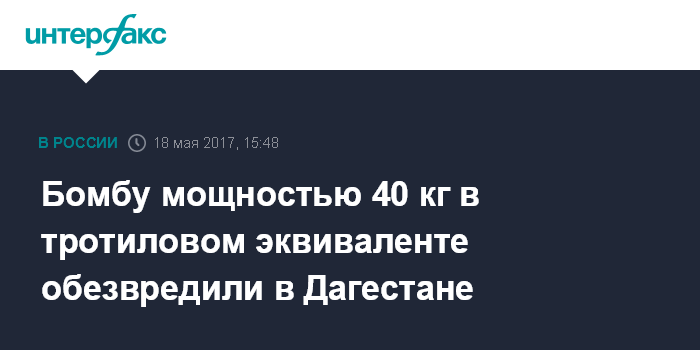 Москва. 18 мая. INTERFAX.RU - Взрывотехники в Гумбетовском районе Дагестана обезвредили самодельную бомбу, сообщил "Интерфаксу" информированный источник.