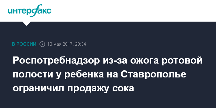 Москва. 18 мая. INTERFAX.RU - Роспотребнадзор приостановил реализацию партии сока, из-за которого ребенок на Ставрополье получил химический ожог рта, сообщает в четверг пресс-служба ведомства.