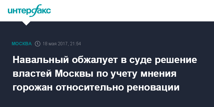 Москва. 18 мая. INTERFAX.RU - Оппозиционер Алексей Навальный обжалует в суде постановление столичного правительства об учете мнения горожан по реновации жилищного фонда в Москве, сообщил "Интерфаксу" адвокат оппозиционного политика Иван Жданов.
