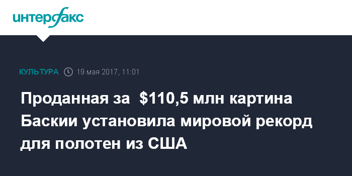 Москва. 19 мая. INTERFAX.RU - Картина Жана-Мишеля Баскии в четверг ушла с молотка на аукционе Sotheby's за $110,5 млн - это рекордная сумма для работ американских художников.