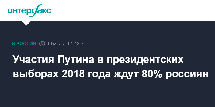 Москва. 19 мая. INTERFAX.RU - Большинство россиян (80%) рассчитывают, что действующий президент РФ Владимир Путин будет участвовать в выборах главы государства в 2018 году, сообщает фонд "Общественное мнение".