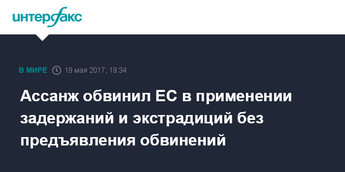 Москва. 19 мая. INTERFAX.RU - ЕС применяет задержания и экстрадиции в отношении людей, которым не были предъявлены обвинения, заявил основатель сайта Wikileaks Джулиан Ассанж, общаясь с журналистами в пятницу.