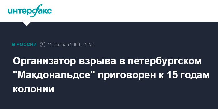 Москва. 12 января. INTERFAX.RU - Городской суд Петербурга в понедельник вынес приговор по делу о взрывах в цветочном ларьке возле станции метро и в ресторане "Макдональдс" в феврале 2007 года.