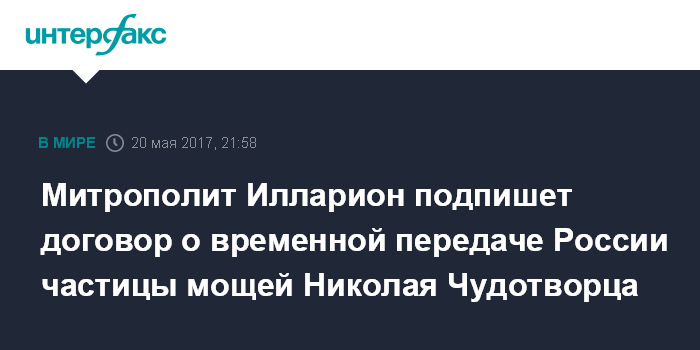 Москва. 20 мая. INTERFAX.RU - Председатель отдела внешних церковных связей Московского Патриархата, митрополит Иларион (Алфеев) и архиепископ итальянского города Бари Франческо Какуччи в воскресенье утром подпишут специальный договор об условиях временной передачи России части мощей святителя Николая.