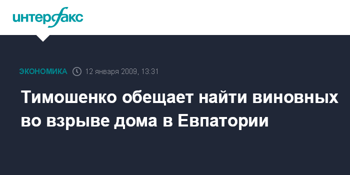 Москва. 12 января. INTERFAX.RU - Премьер-министр Украины Юлия Тимошенко вновь пообещала привлечь к уголовной ответственности всех виновных в разрушении дома в Евпатории (Крым) в конце минувшего года.