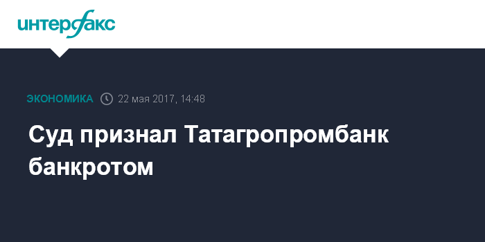 В пресс-службе суда "Интерфаксу" сообщили, что суд открыл в отношении банка конкурсное производство сроком один год. Ранее сообщалось, что иск о признании банкротом Татагропромбанка подал Банк России.