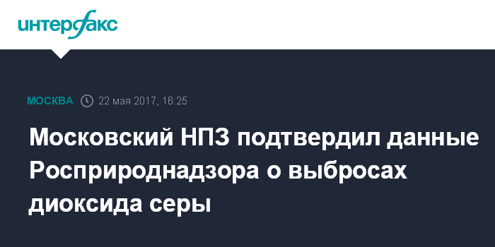 Москва. 22 мая. INTERFAX.RU - Московский нефтеперерабатывающий завод подтвердил данные Росприроднадзора о факте выбросов в атмосферу с превышением ПДК диоксида серы - вещества, входящего в пищевую добавку E 220.