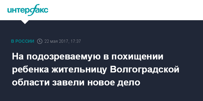 Москва. 22 мая. INTERFAX.RU - Следователи в Волгоградской области возбудили еще одно уголовное дело в отношении жительницы Чернышковского района, подозреваемой в похищении ребенка в Ростовской области и сокрытии смерти приемного сына, сообщила старший помощник регионального прокурора Ольга Токарева.