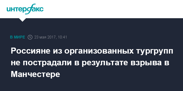 Москва. 23 мая. INTERFAX.RU - Среди пострадавших в результате взрыва на стадионе в Манчестере (Великобритания), по предварительной информации, нет организованных российских туристов, сообщает Ассоциация туроператоров России (АТОР) во вторник.