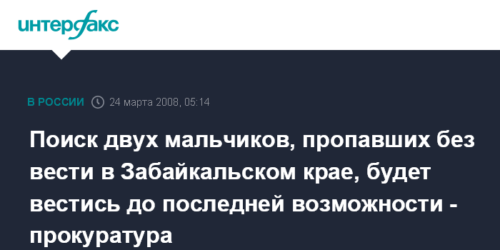 Чита. 24 марта. ИНТЕРФАКС-СИБИРЬ - Прокуратура не намерена прекращать поиск двух мальчиков, пропавших без вести 16 марта в поселке Карымское Забайкальского края