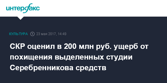 Москва. 23 мая. INTERFAX.RU - Следствие оценивает размер похищенных из бюджета денежных средств, выделенных "Седьмой студии", основанной Кириллом Серебренниковым, в размере 200 млн рублей, сообщили в пресс-службе Следственного комитета.