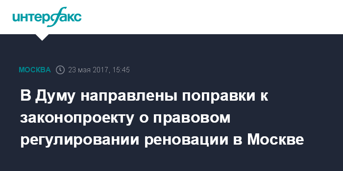 Москва. 23 мая. INTERFAX.RU - Правительство РФ направило в Госдуму поправки к законопроекту об особенностях правового регулирования в сфере обновления жилищного фонда Москвы, сообщается на сайте кабинета министров.